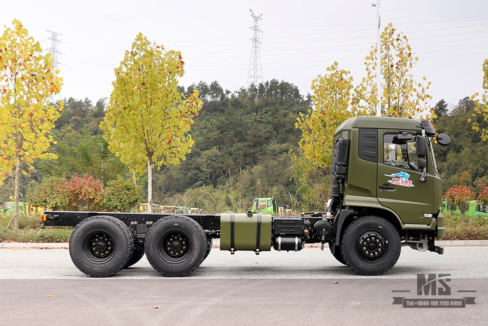 Chassi de caminhão-tanque Dongfeng 6x4 cross-country, o uso da meia cabine em linha Dongfeng, larga e confortável, com motor de alta potência e transmissão de oito marchas faz com que o chassi possa ser modificado com um alto grau de adaptabilidade, pode ser adaptado a uma variedade de troncos, bons duráveis e práticos.